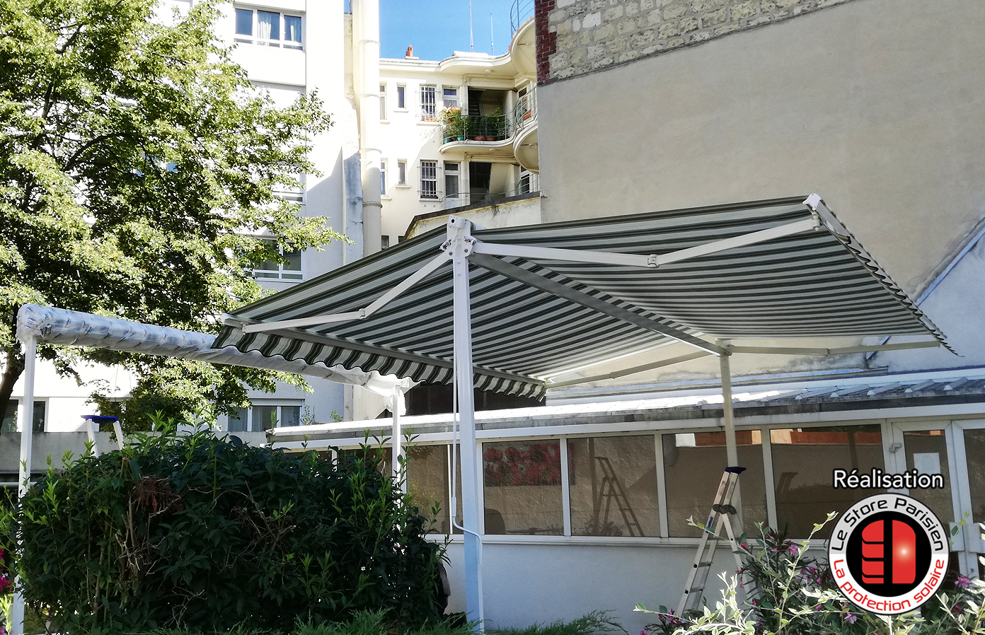 Store banne de grande largeur pour Le restaurant italien Trattoria Rocco, 36 boulevard Pereire à Paris 17ème.